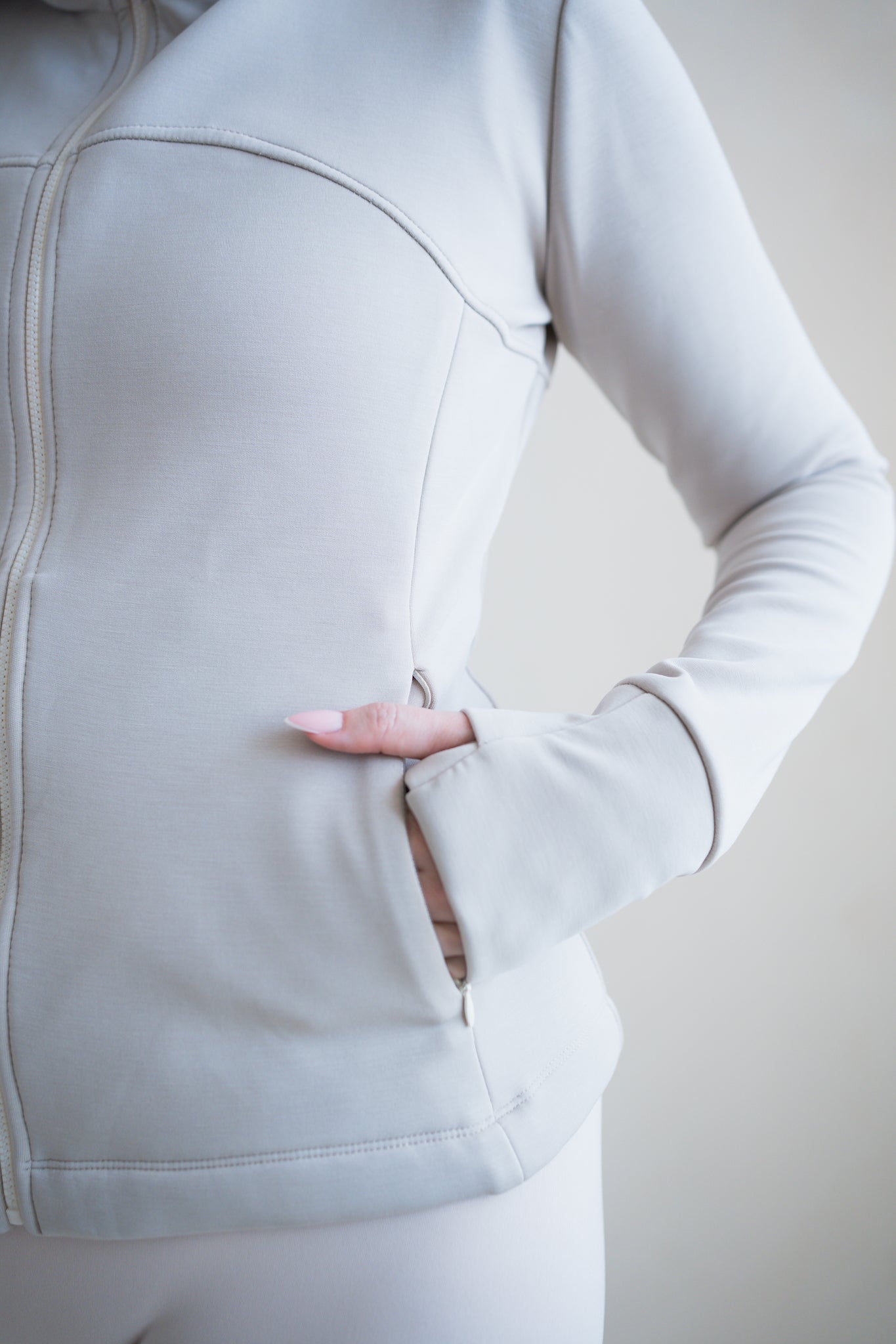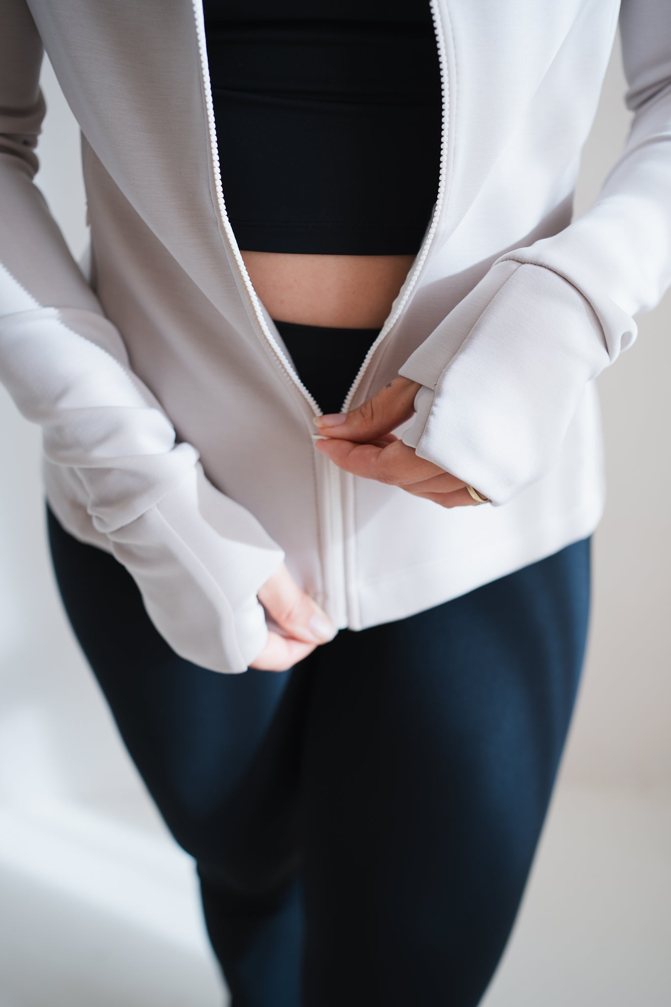Afterclass Jacket je teplá sportovní bunda se zipem a kapucí, inspirovaná střihem Elle Jacket, ale posunutá na další level. Má přiléhavý střih, který lichotí siluetě, ale zároveň nechává plnou volnost pohybu. Rukávy jsou zakončené speciálním nápletem s otvorem na palec – takže se ti zahřejí i hřbety rukou a bunda zůstane na místě i při běhu či jízdě na kole.