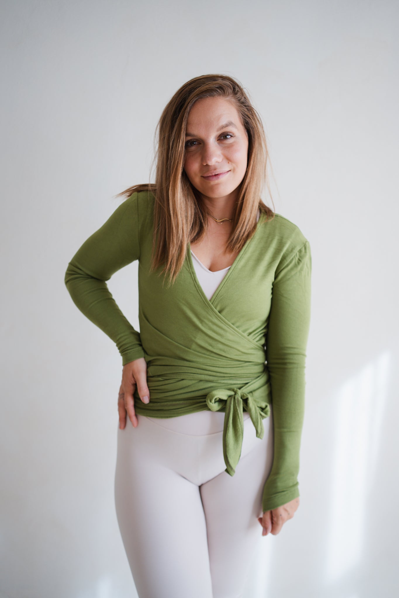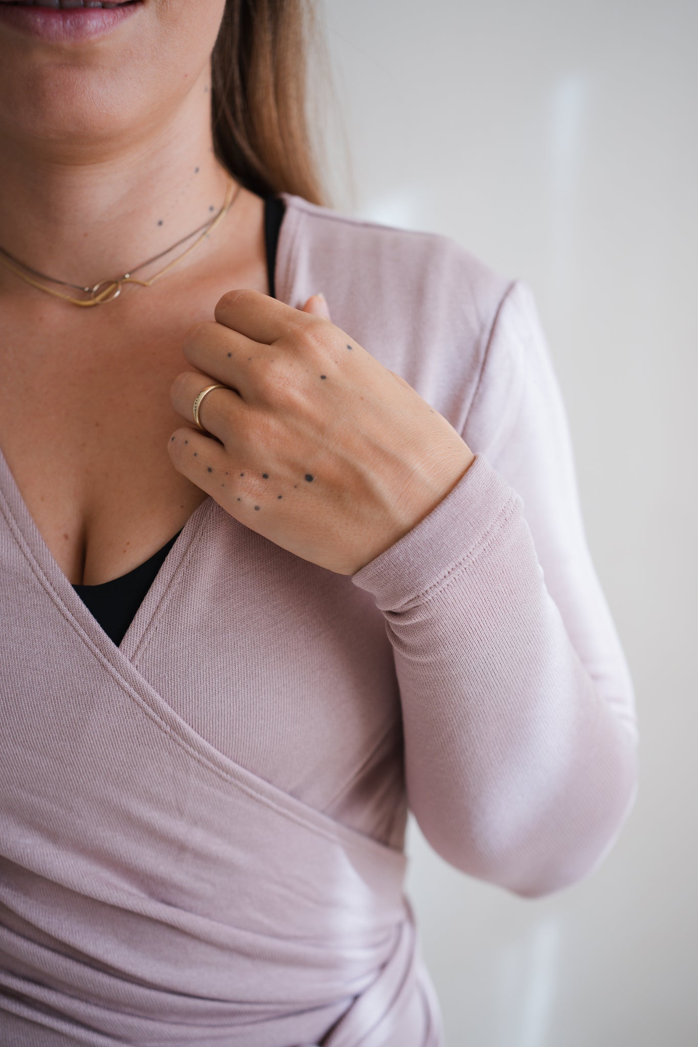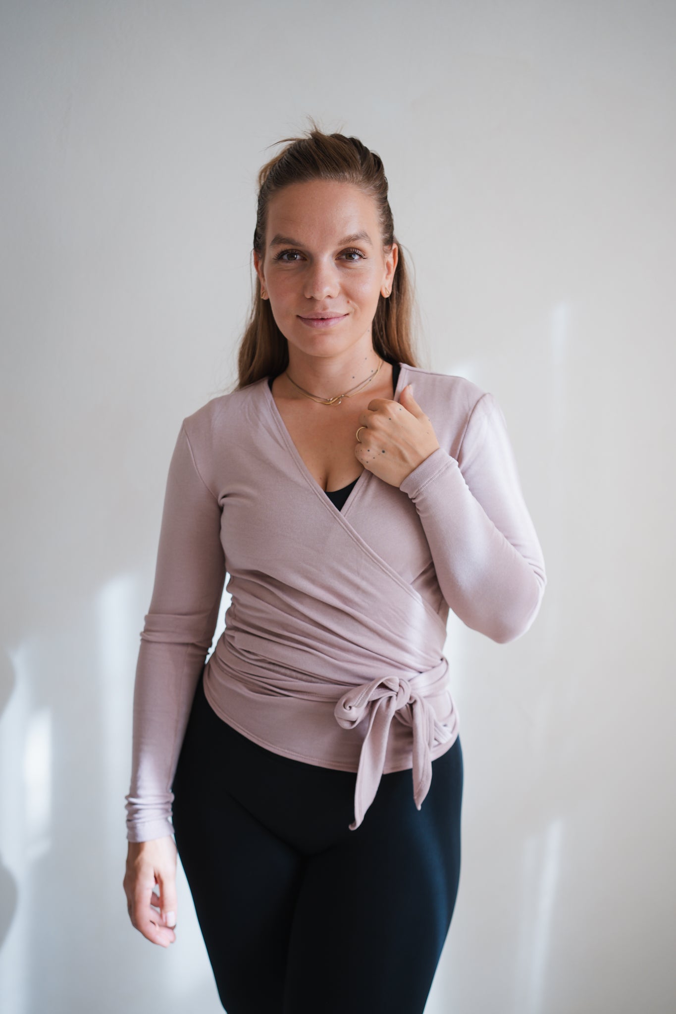 Bamboo Wrap AW jsme ušily ze stejného hebkého materiálu jako jeho letní sestřičku, jen jsme mu dali vyšší gramáž a počesaný povrch, aby tě zahřál v chladnějších dnech. Zůstává jeho ženský střih s překříženým zavinováním, které lichotí postavě a dovolí ti nastavit si hloubku výstřihu přesně podle sebe.