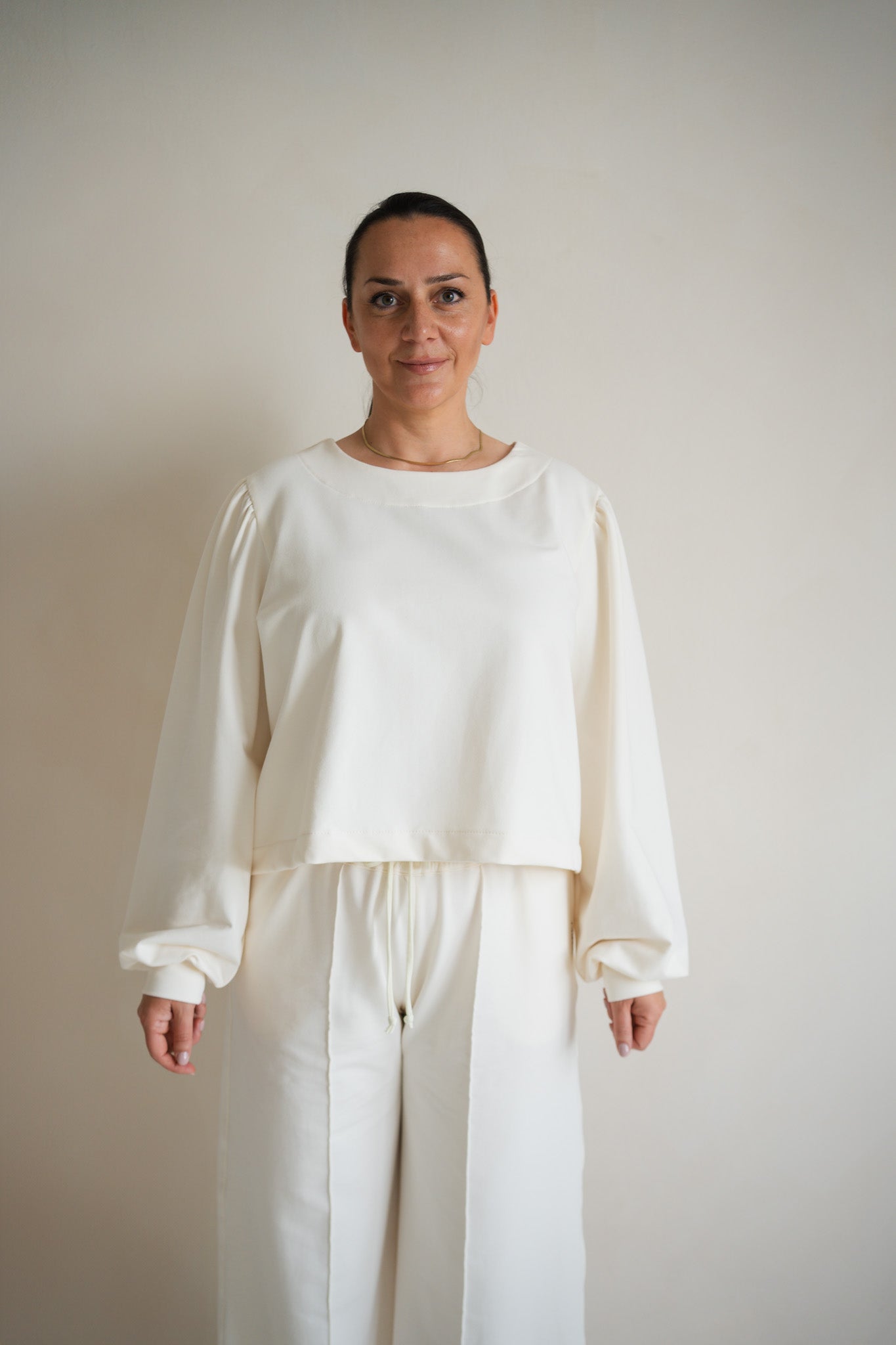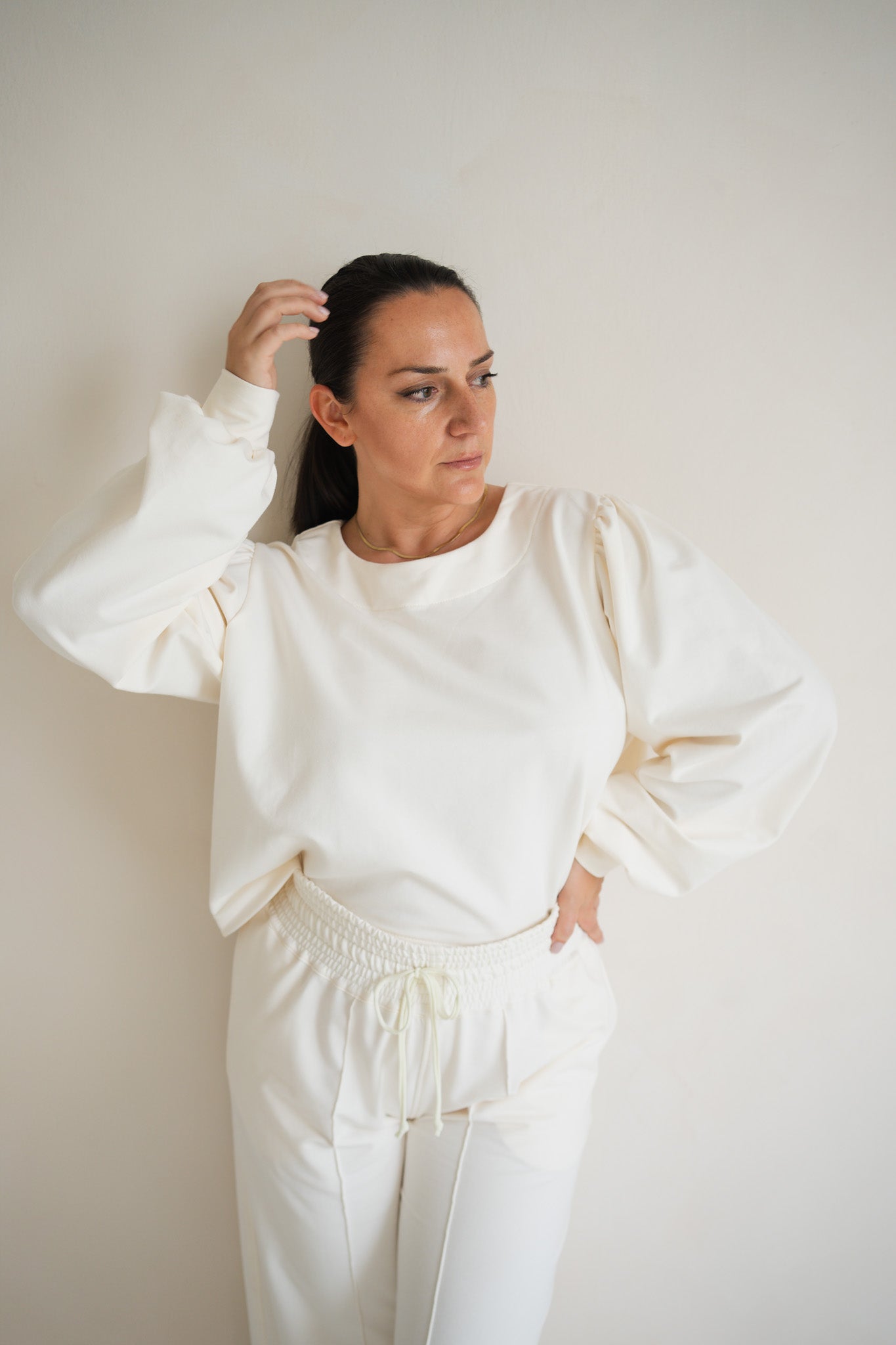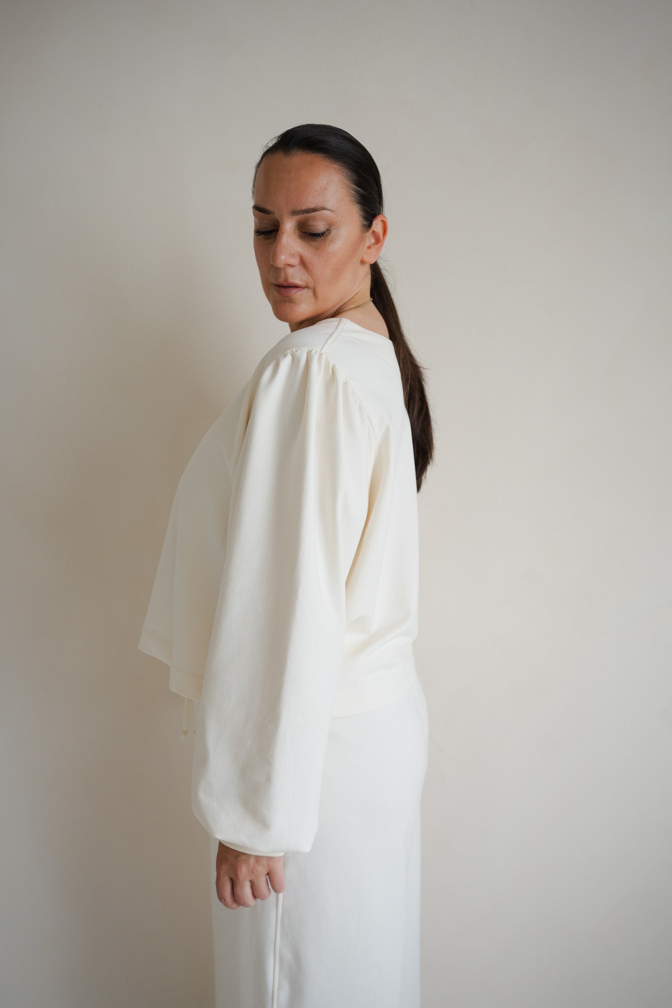 Díky jemně balonovým rukávům s nařaseným zakončením působí romanticky a rafinovaně zároveň. Mikina má ženský, lehce volnější střih, který lichotí postavě a přesto zůstává pohodlný. Elegantní alternativa klasické mikiny, která se hodí stejně tak ke kalhotám jako přes šaty.